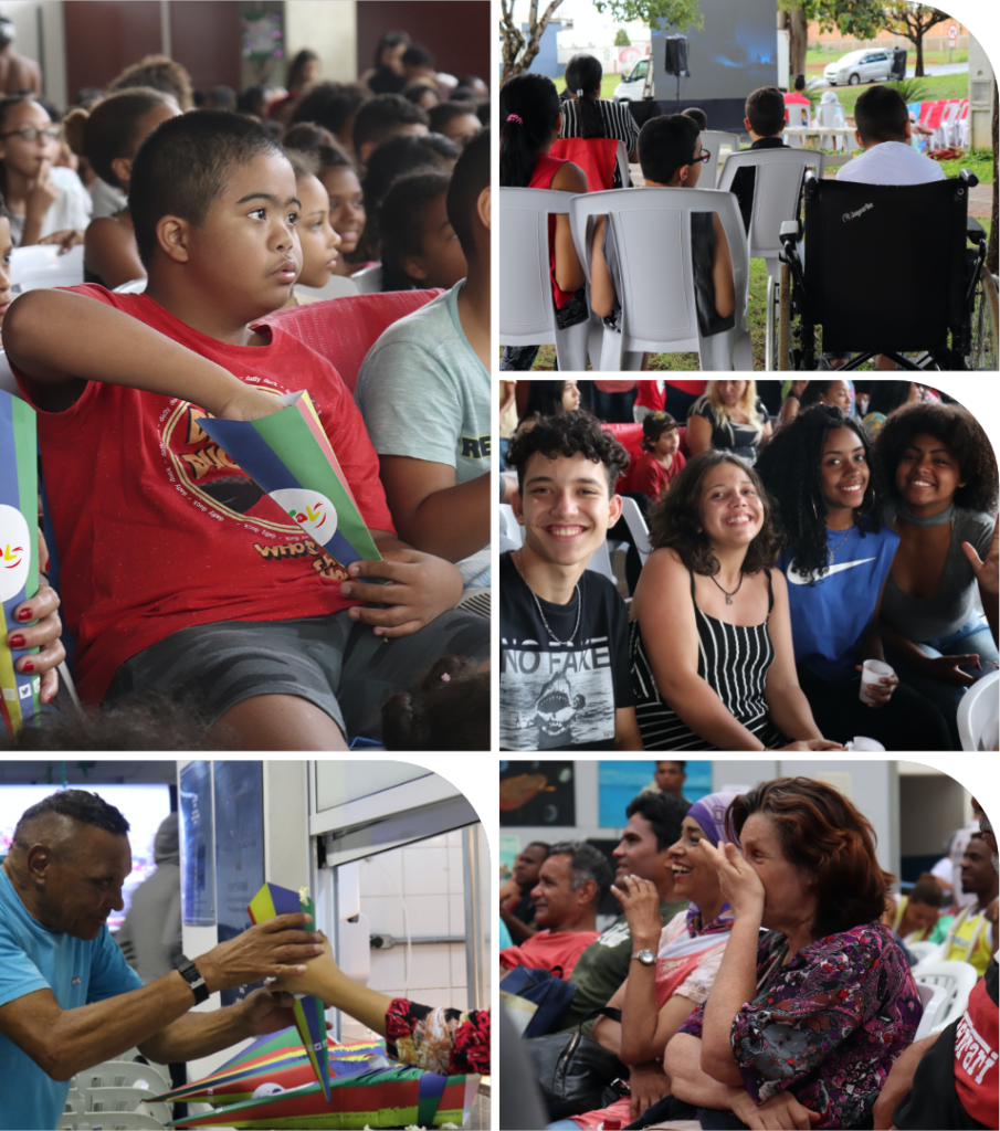 Mas o projeto não se restringe apenas a projeção dos filmes, buscamos proporcionar uma experiência completa. Durante as sessões, que podem ser voltadas para o público infantil, adulto ou família, há distribuição de pipoca e refrigerante a todos, brincadeiras e apresentações musicais, antes e depois das sessões.