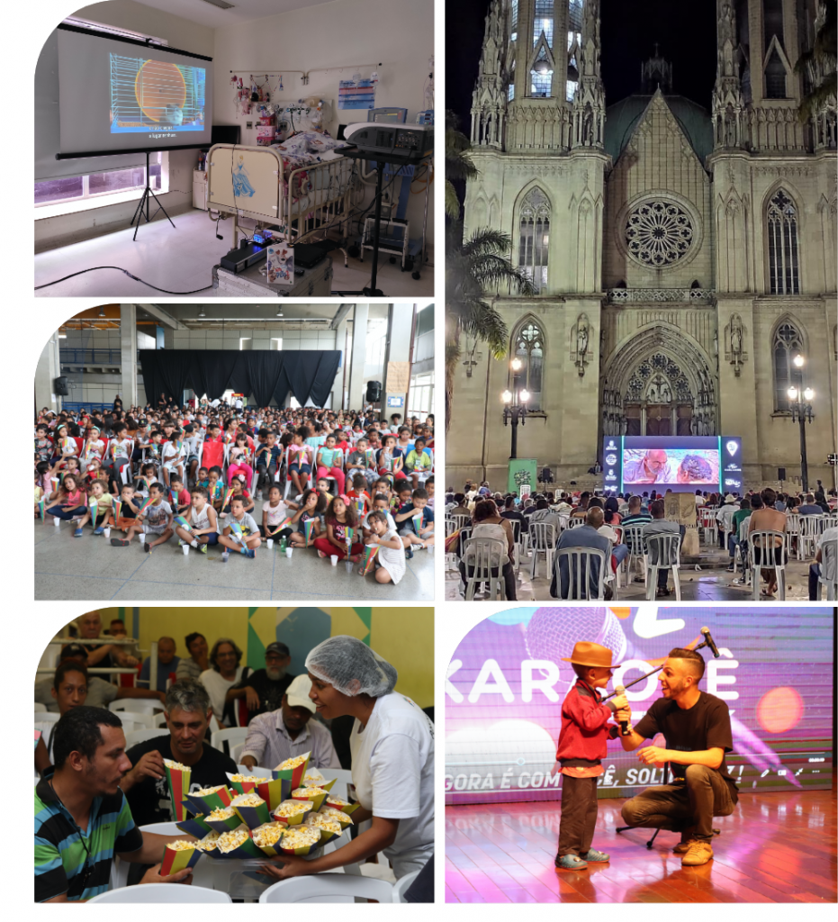 Já foram realizadas mais de 2 mil exibições de filmes nacionais e clássicos internacionais, em 1500 cidades de 6 países diferentes. Em 2017, através do Projeto Cinema Itinerante na cidade de São Paulo, fizemos mostras de filmes para todos os públicos em praças públicas, Centros Educacionais Unificados (CEU), abrigos, albergues e hospitais. E, entre 2018 e 2019, o Projeto Cinema Solidário, contou com apresentações em 33 locais de 12 estados do Brasil, sendo mais de 400 exibições de filmes.